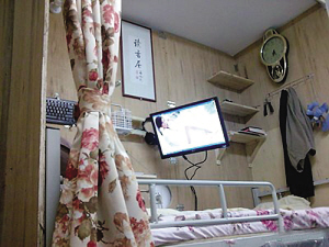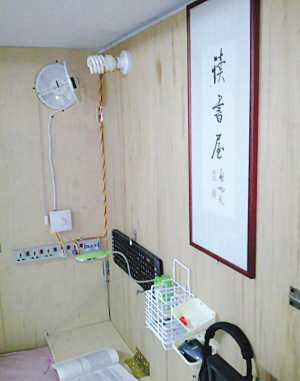 從論壇發(fā)布的照片上可以看到,三張木板及花色窗簾構(gòu)造了一個(gè)豐富的私人空間(圖一)。內(nèi)有照明、電腦及空氣循環(huán)設(shè)備,可伸縮的電腦屏幕和可隨時(shí)收合的寫(xiě)字臺(tái),鍵盤(pán)、鼠標(biāo)和耳機(jī)掛在墻上(圖二),使用的時(shí)候只要旋動(dòng)一個(gè)旋鈕,東西就可以拿下來(lái)在任何地點(diǎn)使用。這個(gè)狹小的空間內(nèi)還有三層木架,可放生活用品(圖三)。最吸引人注目的是該男生還在床頭掛了一幅墨寶——“讀書(shū)屋”。給人的總體感覺(jué)是,這是一個(gè)富有創(chuàng)意又勤奮好學(xué)的學(xué)生。