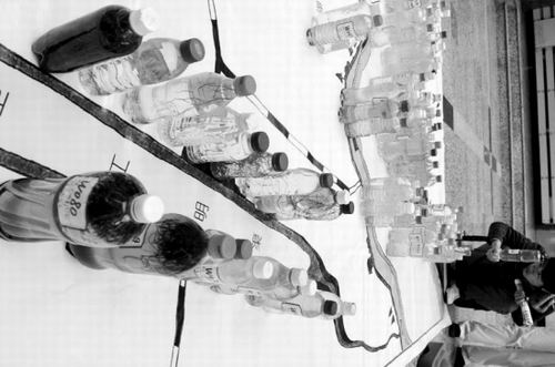我們每天呼吸到的空氣,被裝進了藍色的氣球里,高高地飄在地圖的最上面。它代表著沈陽市的藍天。氣球下面用透明的繩子拴著幾十張照片。仔細一看,這些照片有渾河沿岸美麗的風光、有夕陽、有綠樹,有老人垂釣、有兒童嬉戲,也有學生們拿著瓶子取水樣的場景。而在地圖的最下方,則是一張平面的手繪渾河、衛工明渠等沈陽水質圖。圖的上面擺放著大小不一的塑料瓶,瓶里裝著學生們采來的水樣。