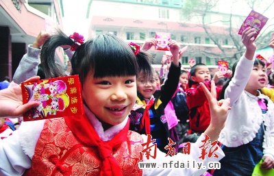 本報訊(記者/謝苗楓實習生/王芝露張晏)紅紅的中國結、大大的燈籠……昨天,廣州市140多萬中小學生正式返校上課,雖然春節已過,但孩子們還沉浸在節日的喜慶中。更開心的是,廣州還將在今年探索以補助方式逐步讓來穗務工就業農民子女接受免費義務教育。