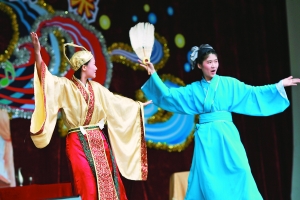 昨日的藝術節上,除了朗誦、歌舞、武術等傳統節目,惡搞的舞臺劇《周瑜的那些事兒》更成為全場焦點。只見臺上女生一副古裝打扮,分別反串周瑜、諸葛亮等男角,學生根據《三國志》內容進行改編,上演了一出“山寨版三國”。對白中既有廣告詞,也有學科知識,更把星爺的經典電影臺詞等運用其中,引得全校師生捧腹大笑。據副班長聶秀婷介紹,因為班里只有9名男生,所以構思的時候就想到了由豪放型的女生“反串”,男生配音的方式聯袂上演。劇本開始是模仿電影《赤壁》進行改編,不過后來就根據現實生活內容“添油加醋”,成為現在的搞笑版本。