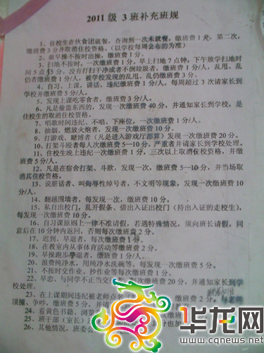 如此多的學生被扣分、罰款,其依據是什么?在班上同學的指引下,記者在該班教室進門靠左的墻上看到兩張《2011級3班補充班規》,班上同學告訴記者:該班規就是扣分、繳罰款的依據。
