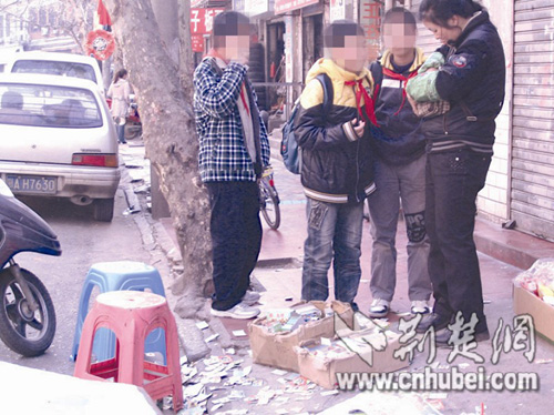26日下午4時許,記者來到鄱陽街小學斜對面的一家副食店,門口丟著許多刮過的廢棄彩票。3名戴著紅領(lǐng)巾的男生圍著副食店的老板娘(如圖),其中一人掏出2元錢,買了4張彩票,現(xiàn)場刮開沒有中獎,嘆了口氣準備離開。記者上前詢問該男生,他說,只要5角錢就能買一張彩票,揭開就有可能中獎,獎金從0.5元到100元不等。
