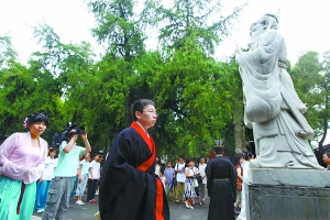 本報訊 今天上午,孔廟大成門下、孔子像前,孔廟和國子監博物館首屆“成人傳統禮儀”在這里隆重舉行,包括2009年北京高考文理科狀元劉庭梅、寧少陽在內的160多名學生參加活動,然而主辦方和媒體過分關注臺上兩位狀元的一舉一動,讓臺下的學生備受冷落。