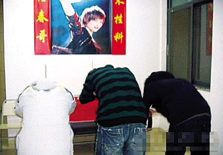 日前,某高校物理學(xué)院同學(xué)小梅在校內(nèi)網(wǎng)上偶然發(fā)現(xiàn)一組雷人的照片:幾名同學(xué)在寢室客廳里貼上了一張巨大的李宇春的海報(bào),兩側(cè)的紅對聯(lián)上赫然寫著“信春哥,不掛科”。對聯(lián)前方是一張鋪著紅布的長方形桌子,上面擺有香煙裊裊的香爐和水果。春哥前,幾個虔誠的春哥“信徒”手執(zhí)高香,頂禮膜拜。