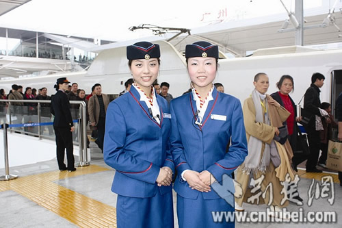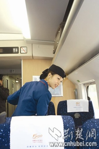 從11月上旬開始,經(jīng)過理論培訓的“準動姐”分別登車至武——京、武——滬線時速250公里的動車組進行試崗操作,開始帶妝為乘客服務(wù)。