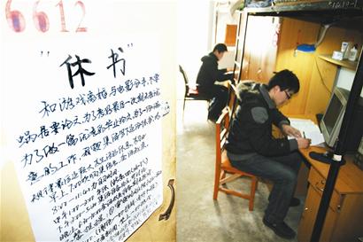 不少路過這間寢室的同學,都覺得“休書”二字很惡搞,不過這也給許多同學提了個醒。618寢室的張昆就表示,“我不想成為‘杯具’,圖書館就是我的第二寢室。”