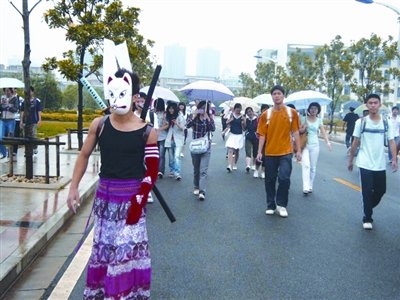 隨后,羅果找同學(xué)借來(lái)面具和忍者刀,找球迷們借了足球襪,又拿出老鄉(xiāng)送自己的娃娃,這樣就搭配出一身獨(dú)特裝扮。他大概在校園走了半個(gè)小時(shí),引起了不小的轟動(dòng)。最后,同學(xué)履約——請(qǐng)他到校外餐館撮了一頓。