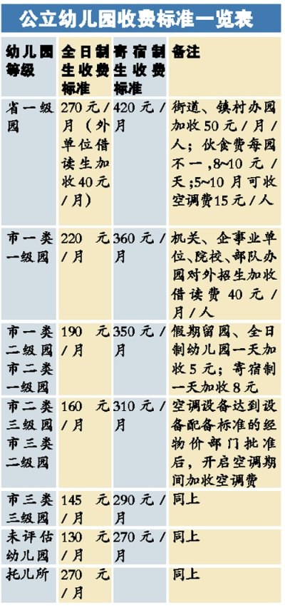 據介紹,公立幼兒園是屬于全市收費最規范的層次,因為按物價局規定,省一級、市一類園、市二類園、市三類園和未評估的幼兒園、托兒所,都有明確的收費標準。公立園的每項收費、標準及收費許可證都須公示在公布欄。不過,這一層次也是目前全市幼兒園中最少的。