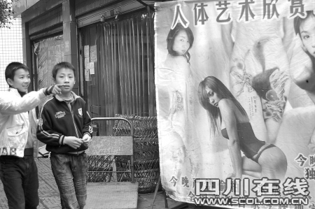 記者在觀察的10多分鐘發(fā)現(xiàn),先后有宜賓縣育才中學、柏溪小學的100多名小學生從這里經(jīng)過,部分學生圍在宣傳畫前指手畫腳。在電影院附近開店的彭先生不無憂慮地告訴記者:“孩子們肯定會受到影響的。”