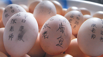 由于戴著口罩上課,張老師為讓學生們能夠聽清楚,經常一句話要重復兩三遍,一堂課下來常常累得口干舌燥。即使是這樣,張小林仍然一直堅持著。看著張老師戴著“面具”上課,初二一班的同學們悄悄湊了130個雞蛋,每個雞蛋上都寫著:“張老師,祝你早日康復!”“張老師,快點好吧”……學生余南瀾說,在班干部提議下,同學們每人拿兩個雞蛋送給張老師,一是祝福他,二是希望能為他補充營養(yǎng)。