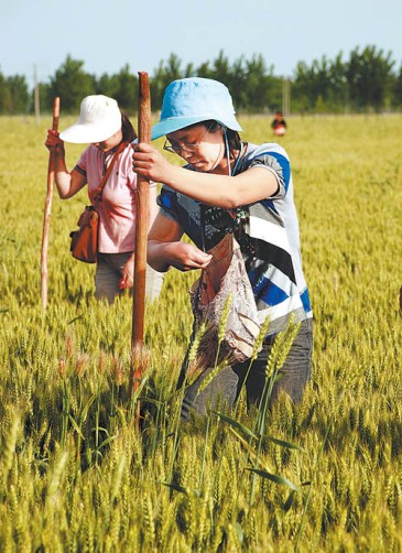 5月23日,河南省安陽市湯陰縣花耳莊村大學生“村官”張文紅(前)在即將收割的麥田幫助困難農戶套種玉米。