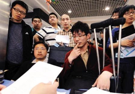 一位殘疾人大學生在招聘會上面試 新華社圖