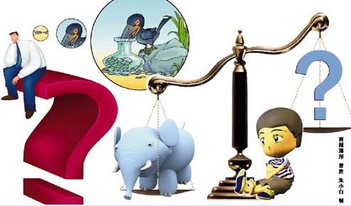《曹沖稱象》是一篇贊揚小孩聰明的文章,五六歲的曹沖就能夠想到用石頭代替大象稱重的方法。同樣是在這本課外教材里,《曹沖稱象》也被改成了雷人的題目,“不用稱石頭的方法,還能想出更好的辦法來稱象嗎?”