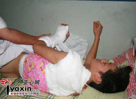 5月16日,記者在昌吉市人民醫院外一科見到了受傷的朱斌,他側著躺在病床上,說起話來很吃力。他的左臂、背部、胸部,腿部都被包扎了起來。