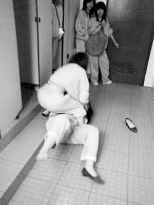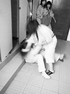 殷瓊是上海西南工程學(xué)校一年級(jí)學(xué)生。4月16日下午,她參加考試,題目差不多做完了,同學(xué)小成對(duì)她耳語(yǔ):“下課去校門(mén)口,有人找你談話。”殷瓊沒(méi)答應(yīng),小成幫她交卷,把她拉到校內(nèi)一幢大樓2樓女廁所門(mén)前,那里還有幾個(gè)女生在等著。拉扯進(jìn)廁所后,另一名同學(xué)劉幸一邊拍她肩膀挑釁,一邊讓其他女生打開(kāi)手機(jī)攝錄。視頻記錄了殷瓊的噩夢(mèng),殷瓊的母親向記者出示了這段影像:
