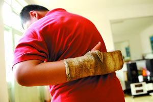 第二次受傷在5月21日。曹力強說,“那節是社會課,我在課上問了同學一個問題,教社會課的張老師朝我走過來,我當時害怕,就從座位上起身,往教室后面躲,到教室最后面,我拿掃帚擋著身體,張老師抓住我的左胳膊往后別,還掰我手指。”