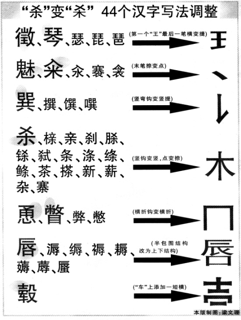 據(jù)《信息時報》報道,《通用規(guī)范漢字表》擬對44個漢字“動刀整形”,調(diào)整其寫法,記者留心發(fā)現(xiàn),44個漢字中,不少字都是平時的常用字。比如:“琴”、“唇”、“親”、“雜”、“殺”等,而新規(guī)范的寫法又與原字只是個別筆劃上略有變化,整體相差不大。