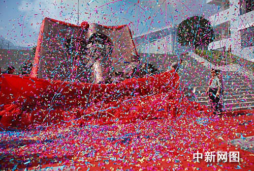 中新網汶川8月30日電(鐘美蘭)紅旗招展,彩帶飄飄。30日,由第二炮兵對口支援,在廢墟原址上建設汶川八一小學開學,學校舉行了隆重的開學典禮。