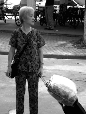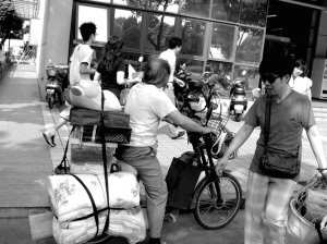 爺爺輩的送新族——一位頭發(fā)花白的老者騎著一輛電動車,車后綁滿了大大小小的包裹、箱子。一個女孩皺著眉頭對老者抱怨著什么。原來,女孩因為父母沒能陪同前來非常生氣,她向老人埋怨說,別人都有父母代辦手續(xù),而自己必須獨自排隊繳費。老人的銀發(fā)在風中顯得零亂,額頭上滲出的汗珠在秋日的陽光里閃閃發(fā)亮。