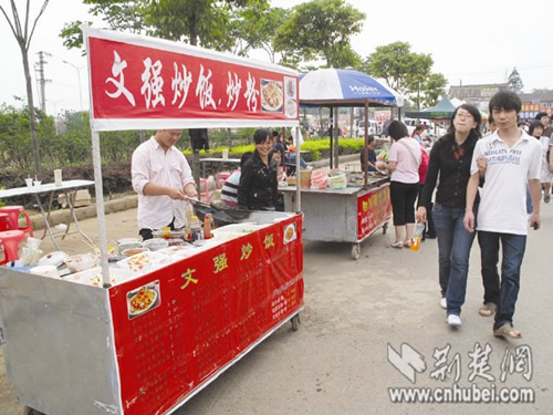 荊楚網(wǎng)消息 (楚天金報) 記者邵娟 通訊員劉磊報道:“文強炒飯?文強不是重慶的貪官嗎?老板竟用這種噱頭吸引顧客?”日前,武漢科技大學校門前一家名為“文強炒飯”的攤位,雖然吸引了過往大學生的眼球,但因被認為是店主找的“噱頭”,所以生意并不好。