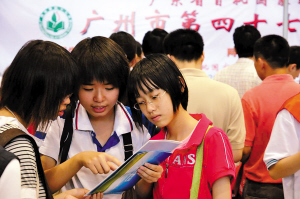 在廣州市旅游商貿(mào)職業(yè)學校的攤位前,由于學校帶來的1萬份材料都發(fā)放完畢,該校副校長、就業(yè)辦主任、教務處負責人“全員出動”,給前來咨詢的學生、家長作“口頭宣講”。校方講得賣力,家長也記錄得起勁。