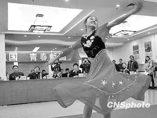 8時10分,面試開始,第一個上場的陳曉琴做了簡單的自我介紹,大屏幕顯示她抽中的問題是:如何能做一個合格的軍人。陳曉琴說,要做一名合格的軍人不但要嚴明紀律、聽從指揮,還要團結同志。接著她表演了跆拳道,并拿下了北京市女兵面試的第一個分數——26分,全部考試,陳曉琴用了8分鐘。 8時50分,來自民族大學舞蹈學院的5號應試者朱瑜上場了。回答了相關的問題后,她拿出了一把藍色的綢扇,跳起了一套她自編的舞蹈,婀娜的舞姿征服了全場的觀眾,也征服了9位評委,她得了28.57的高分,這個分數也是海淀考區全天考試的最高分。與她同樣得了最高分的還有清華大學的王曉麗。