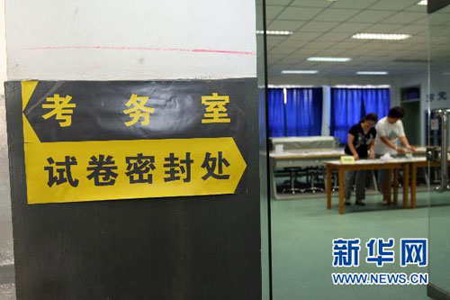 6月4日,考務人員在北京166中學考點進行準備工作