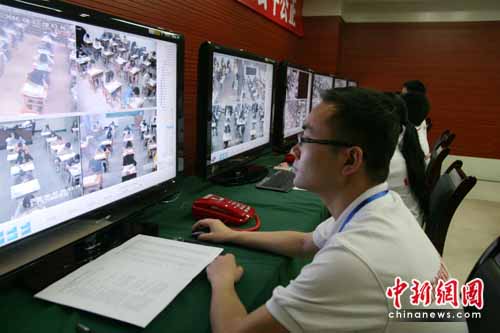 重慶高考考場工作人員利用電子設備監控考場情況。孟幻 攝