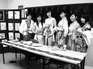 絢麗的旗袍和女孩子們的笑容贏得了極高回頭率。很多英國人來問哪里可以買到旗袍。姑娘們就抓住這個機會向外國學生介紹中國的餃子、書畫等。