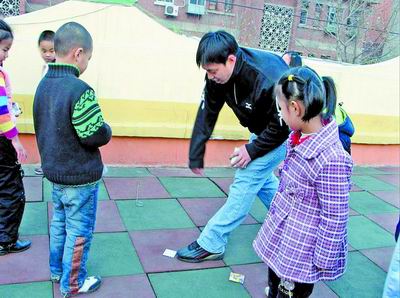 而在“玩”的時候,男女老師的不同就會顯現而出。據介紹,女老師一般是和孩子們玩一些如丟手絹之類活動量較小的游戲,而男老師就會帶著孩子們玩一些活動量較大的項目,比如競技賽跑等。“男老師帶的班上的孩子會比較‘瘋’,這是我們愿意看到的,孩子充滿活力是件好事。”劉明陽說。