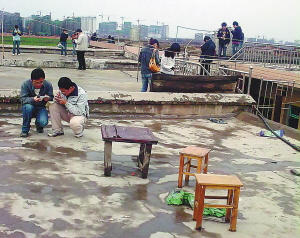3月 28日上午,是今年全國計算機考試的筆試時間,據該學員說,老師考前讓每名考生帶一位親友,統一在學校教室集合。筆試開始幾分鐘后,教室里的老師便得到了考題。老師在黑板上一行行地寫出了:1-5324431-641423……人們紛紛拿出手機(見上圖)。20多分鐘后,這名老師擦去黑板上的字,急急離去。由于朱洪學校當天參加筆試的約有幾百名學員,從教室里到外面空地,忙著發送短信的考生親友隨處可見(見下圖)。該知情者說,那名老師寫在黑板上的 “32443”分別代表著“CBDDC”,這些“數字”和隨后寫出的“漢字”,便是筆試中的“選擇題”和“填空題”的答案。