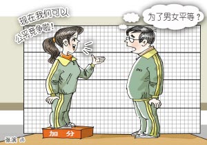 對于合理性的要求,則應該再仔細商榷!芭⒃谏敫咧谢蚴泄芨黝愔袑、職業學校時,筆試總成績加2分。”從現實來看,女孩的考試能力并不比男孩差,這樣的差別待遇,可能不具有說服力。