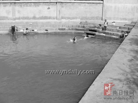 滇南武校內有一個游泳池,但多年未用,泳池成了學生晾曬衣服的場地。游泳池的南側還有一池子,池內的水就是從校外公路邊引來的龍潭水。池子的北面是走道,地面高出水面約150厘米。池子的東、南、西3面都有臺階下到池底,學生們可以在這里洗衣服,當然,練武的學生們也會在課后站到不深的池內擦擦身子。