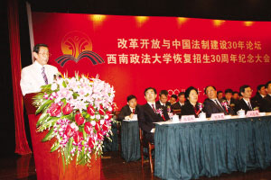 昨日,西南政法大學(xué)恢復(fù)招生30周年紀(jì)念大會(huì)召開,全國人大常委會(huì)副秘書長(zhǎng)李連寧、國務(wù)院法制辦副主任張穹、最高人民法院副院長(zhǎng)江必新、最高人民檢察院副檢察長(zhǎng)朱孝清、中共重慶市委副書記張軒等出席論壇。幾位副部級(jí)以上高官盡管職務(wù)不同,但都喜歡把自己稱為西政人。