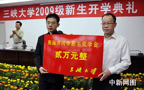 開學典禮上,三峽大學校長李建林為5名新生頒發錄取通知書,三峽大學黨委副書記何偉軍為周海洋頒發了2萬元新生獎學金。隨后,周海洋作為新生代表發言,他說,自己是懷著感恩的心態進入三峽大學的,站在新的人生起點,他最大的希望是4年內學有所成,以此報答學校的培養和家人的厚望。周海洋的發言不似他的文章那般酣暢淋漓,而是顯得有點語無倫次,他多次表示是由于太激動的緣故。