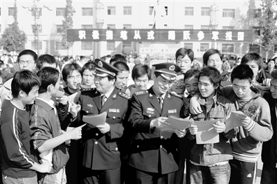 13萬(wàn)大學(xué)生進(jìn)軍營(yíng),是在一個(gè)特殊的背景下提出的。今年3月5日,十一屆全國(guó)人大二次會(huì)議上,國(guó)務(wù)院總理溫家寶在政府工作報(bào)告中明確提出,高校畢業(yè)生可“到農(nóng)村基層服務(wù)和參軍入伍”。為鼓勵(lì)高校畢業(yè)生攜筆從戎,教育部、財(cái)政部、總參謀部等部門專門出臺(tái)了八項(xiàng)優(yōu)惠政策。這些舉措,充分體現(xiàn)了國(guó)家對(duì)應(yīng)屆大學(xué)畢業(yè)生的關(guān)懷。但是,軍隊(duì)敞開(kāi)大門征召大學(xué)畢業(yè)生的意義和作用,不僅僅是為了單純地緩解社會(huì)就業(yè)壓力,更蘊(yùn)含一個(gè)深刻的時(shí)代主題。