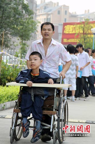 中新網宜昌6月20日電(記者 劉良偉 上官純青)20日,湖北宜昌7.7萬名學子參加了當地的中考,這其中有一位特殊的孩子——宜昌市十五中905班的王宇,在父親的陪伴下,來到當地專門設立的特殊考生考場參加了考試。十多年來,父親王忠(化名)為患有罕見的肌肉營養不良癥的王宇,和妻子沒有放棄,用人間真愛一路陪伴著兒子,無論風吹雨淋,他都執著地背孩子上學,并自己鉆研醫學,以身試藥,用真心真愛演繹著平凡人生里不朽的傳奇。