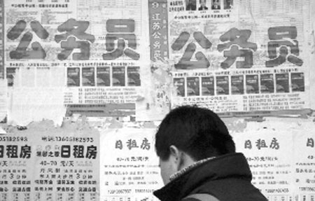 昨天,記者從南京幾所高校校內(nèi)信息公告欄里看到,公務(wù)員考試輔導(dǎo)班大有風(fēng)頭蓋過考研輔導(dǎo)班的趨勢,連學(xué)生宿舍樓門口、餐廳門口公告欄上,也張貼著公務(wù)員考試輔導(dǎo)的招生海報。
