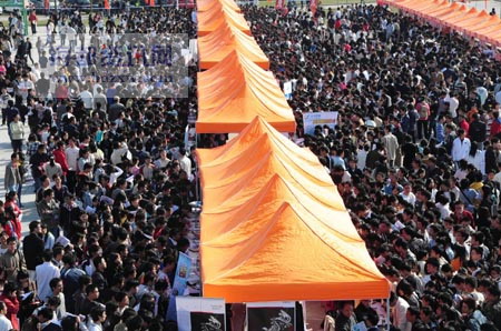 酒店“門童”、“運送員”,這些原本與大學(xué)生不沾邊的崗位,昨日(11月20日)出現(xiàn)在福州舉行的大學(xué)生招聘會上。昨日,由福建省人事廳、中國海峽人才市場聯(lián)合舉辦的“福建省2009年大中專畢業(yè)生福州地區(qū)大學(xué)新校區(qū)專場招聘會暨大學(xué)生見習(xí)招聘會”,在福建師范大學(xué)旗山校區(qū)拉開帷幕,有上萬名學(xué)生進場應(yīng)聘。