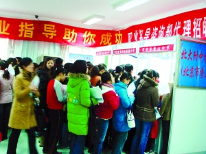 九點鐘招聘會剛剛開始,石景山小學、石景山區實驗中學、北京第五十七中學的展位前就排起了長龍。與之形成鮮明對比的是,旁邊打出“年薪十萬招校長、副校長”招牌的北京新年華精英教育展位前卻很冷落。