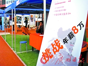記者在廣州美術學院大學城校區的招聘會場看到,一個獨特的攤位吸引了人們的目光,攤位前擺放著一張白色的“廣告”,上書“挑戰年薪8萬”幾個大字,“廣告”后面的桌子上擺放著許多設計大賽的獲獎證書和獎杯,“優秀團員”、“優秀學生干部”、“優秀團干部”、“二等獎學金”……一張張獎狀看得人眼花繚亂,原來這是廣州美術學院畢業生莫忠才的“展位”。