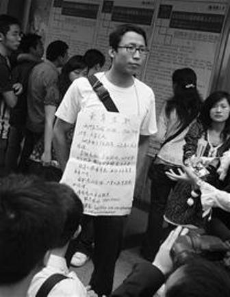4月26日,一位身著淺藍(lán)色T恤、戴著黑邊眼鏡的男青年出現(xiàn)在成都市寧夏街人才市場門口。他的穿著打扮很普通,胸前掛的一塊“賣身求職”的牌子卻十分醒目,引來眾人圍觀。從這塊白紙紅字的牌子上可以得知,這名男子叫王志強(qiáng),今年25歲,身高1.75米,大學(xué)文化。2005年他南下廣東,干過兩年管理工作。由于金融危機(jī),企業(yè)倒閉,所以“現(xiàn)賣身求職,要求年薪至少10萬元。”
