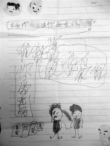 “我愛你王××,你愛我嗎!”從筆記本撕下的紙張上端整齊地寫著一行字,字被框了起來,比較醒目。紙張下端,畫著一個獨辮子女孩和一個男孩牽著手,一旁標(biāo)注著“我愛你,你愛我”。