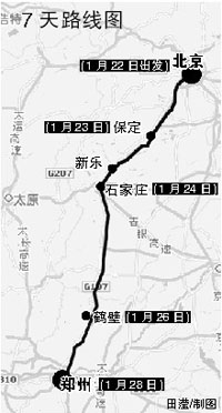 第二天他從保定出發(fā)時(shí),路上已經(jīng)結(jié)滿了冰,給前行帶來了困難。“我總結(jié)出一些經(jīng)驗(yàn),比如只能堅(jiān)持前進(jìn),不能長時(shí)間休息,否則就會泄氣。中途體力不支的時(shí)候可以停下來吃點(diǎn)巧克力補(bǔ)充,但時(shí)間也不能太長。”就這樣,高富松一路向南,23號留宿新樂,24號留宿石家莊,一步步向目標(biāo)靠近。