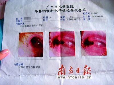 8月18日,何女士帶著耳痛未減的小賢復診,經過電子鏡檢查,診斷為左耳鼓膜外傷性穿孔。“里面已經破了一個口,孔里和四周充滿紅色的血漿。醫生說聽力降低了20-30分貝。”何女士指著化驗單,一臉憂心忡忡。