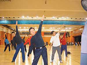 記者昨天在培訓(xùn)現(xiàn)場發(fā)現(xiàn),西城區(qū)中小學(xué)體育教師幾乎悉數(shù)到齊,一些老師趁休息空當(dāng)在琢磨動作。很快,一些上年紀(jì)的老師就已汗流浹背。西城區(qū)教委體育科胡惠霞科長介紹說,此次培訓(xùn)要求中小學(xué)體育老師學(xué)會各自需要推廣的兩套操,培訓(xùn)結(jié)束回校后須在一周之內(nèi)完全熟練,然后向?qū)W生推廣。預(yù)計下月該區(qū)中小學(xué)生可以正式做起第三套廣播體操。胡科長表示,此次培訓(xùn)嚴(yán)把教師關(guān),新廣播體操的熟練程度計為教師基本功的一個部分,并納入體育老師的考核內(nèi)容,只有培訓(xùn)合格的體育老師才能上崗。