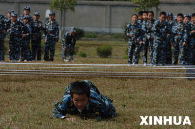 江東區兒童軍校一位小學員匍匐穿越“電網”