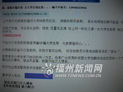 吳同學(xué)將情況反映給師大傳承家教中心。15日傍晚,在福州便民論壇,一則標(biāo)題加亮的帖子《最新詐騙手段,女大學(xué)生請注意,騙子手機號……》發(fā)布。帖子寫著:“上午我方接到福州大學(xué)教員反映,她接的家教,家長利誘她去聊天陪客,月薪上千。經(jīng)核查,該家長自稱姓林,家住左海附近,給上初一的女兒請一名女大學(xué)生當(dāng)家教。他還特意強調(diào)要家庭貧困的女大學(xué)生,該家長手機號為139xxxxxxx6”。該帖子也寫明了他們之所以曝光該家長手機號碼的原因:“我們不想讓女生被不法之徒玷污!