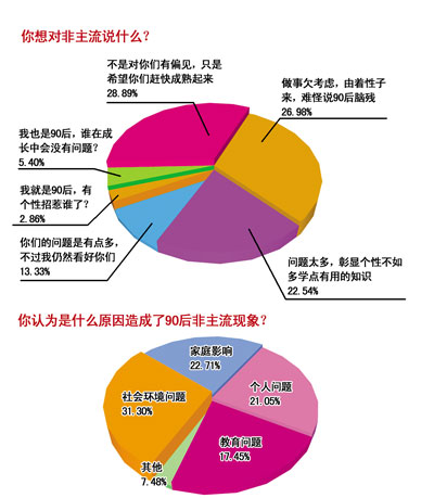 “難道靠個性就能吃飽飯,作為80后,看到你們非主流一族我很沉痛。”網(wǎng)友“彩虹星星”在給90后非主流的忠告這一項中如此說道。“真的對你們沒有偏見,只希望你們趕快成熟,做事不要由著性子來,追求潮流也要繼承前人的好傳統(tǒng)呀!”在調(diào)查中,網(wǎng)友們對90后寄予希望,勸他們能多學(xué)知識,讓自己成熟起來,別再出現(xiàn)非主流行為。