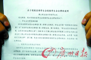 記者調(diào)查了解到,佛山職業(yè)技術(shù)學(xué)院是佛山的一所大專院校,共有十幾個(gè)專業(yè),三年制,全校共有3000多名學(xué)生。從2007年年底,該學(xué)院的學(xué)生會要求全校學(xué)生交納學(xué)生會會費(fèi),開始時(shí)是每年交一次,一次交20 元,后來改成一次性交齊60元。三個(gè)年級三年下來收費(fèi)將達(dá)18萬元。